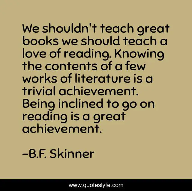 This page presents the quote "We shouldn't teach great books we should teach a love of reading. Knowing the contents of a few works of literature is a trivial achievement. Being inclined to go on reading is a great achievement.". Author of this quote is B.F. Skinner. This quote is about great, love, achievement, teach, reading, trivial, affection,.