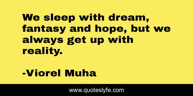 This page presents the quote "We sleep with dream, fantasy and hope, but we always get up with reality.". Author of this quote is Viorel Muha. This quote is about realitate, reality-of-life, love, affection,.