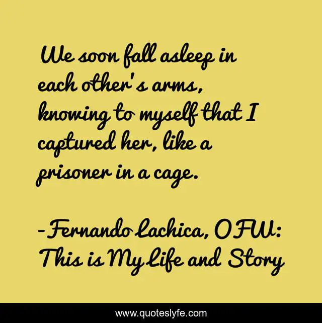 This page presents the quote "We soon fall asleep in each other’s arms, knowing to myself that I captured her, like a prisoner in a cage.". Author of this quote is Fernando Lachica, OFW: This is My Life and Story. This quote is about life, love, philippines, revenge, dubaicity, lust, ofw, hatred, dream,.