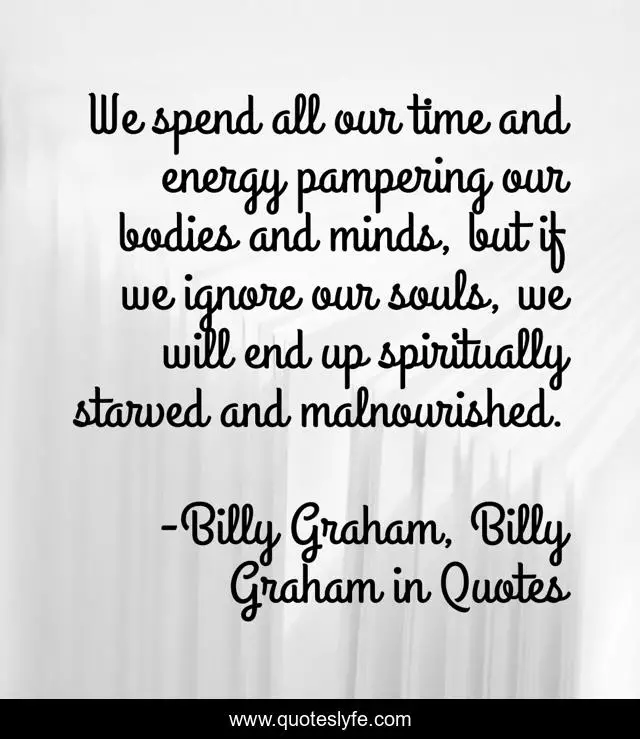 This page presents the quote "We spend all our time and energy pampering our bodies and minds, but if we ignore our souls, we will end up spiritually starved and malnourished.". Author of this quote is Billy Graham, Billy Graham in Quotes. This quote is about billy-graham, the-soul,.