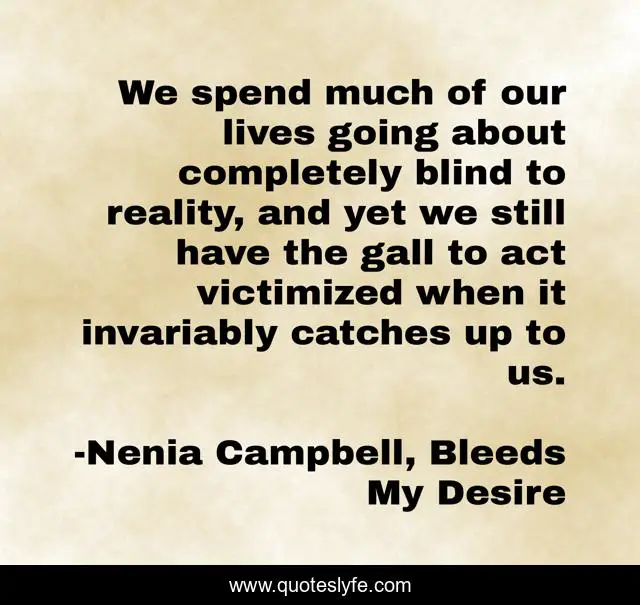 This page presents the quote "We spend much of our lives going about completely blind to reality, and yet we still have the gall to act victimized when it invariably catches up to us.". Author of this quote is Nenia Campbell, Bleeds My Desire. This quote is about nenia-campbell, living, life, reality-of-life, reality, reality-check,.