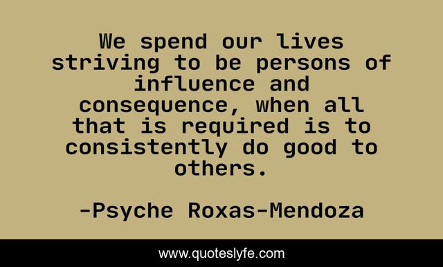 This page presents the quote "We spend our lives striving to be persons of influence and consequence, when all that is required is to consistently do good to others.". Author of this quote is Psyche Roxas-Mendoza. This quote is about consequence, good-inspirational, influence, persons,.