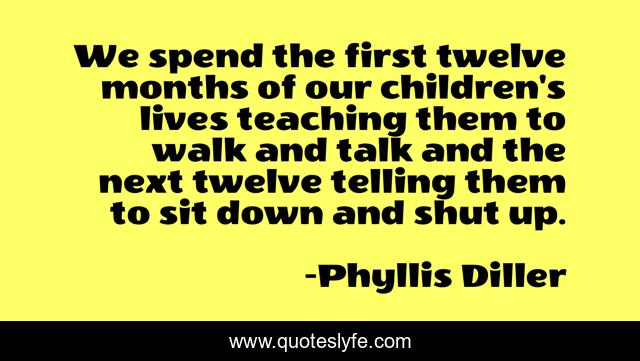 This page presents the quote "We spend the first twelve months of our children's lives teaching them to walk and talk and the next twelve telling them to sit down and shut up.". Author of this quote is Phyllis Diller. This quote is about down, children, walk,.