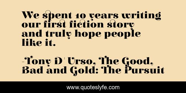This page presents the quote "We spent 10 years writing our first fiction story and truly hope people like it.". Author of this quote is Tony D'Urso, The Good, Bad and Gold: The Pursuit. This quote is about fantasy, amreading, fiction, goodbadgold,.