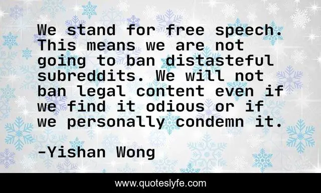 This page presents the quote "We stand for free speech. This means we are not going to ban distasteful subreddits. We will not ban legal content even if we find it odious or if we personally condemn it.". Author of this quote is Yishan Wong. This quote is about speech, stand, free,.