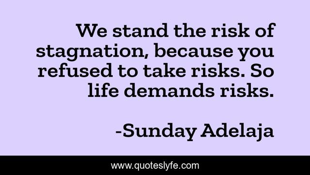 This page presents the quote "We stand the risk of stagnation, because you refused to take risks. So life demands risks.". Author of this quote is Sunday Adelaja. This quote is about we, because, risk, demands, stagnation, life, refused, stand, risks,.