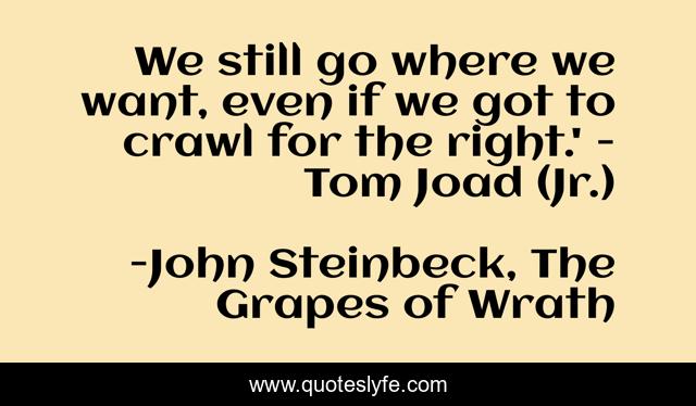 This page presents the quote "We still go where we want, even if we got to crawl for the right.' - Tom Joad (Jr.)". Author of this quote is John Steinbeck, The Grapes of Wrath. This quote is about dignity, pride, strong, hardened,.