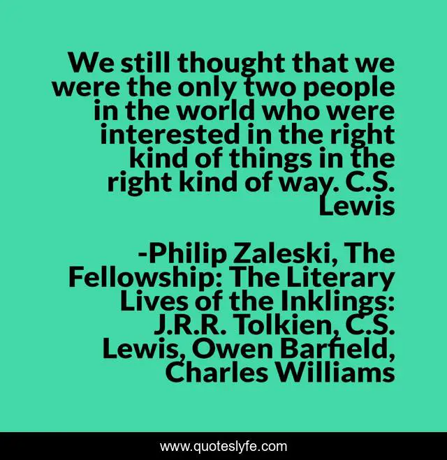This page presents the quote "We still thought that we were the only two people in the world who were interested in the right kind of things in the right kind of way. C.S. Lewis". Author of this quote is Philip Zaleski, The Fellowship: The Literary Lives of the Inklings: J.R.R. Tolkien, C.S. Lewis, Owen Barfield, Charles Williams. This quote is about elitism, arrogance, bias, perspective, clique, openness,.