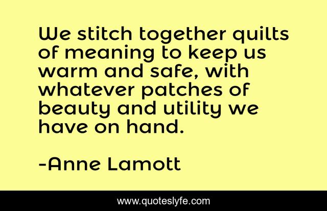 This page presents the quote "We stitch together quilts of meaning to keep us warm and safe, with whatever patches of beauty and utility we have on hand.". Author of this quote is Anne Lamott. This quote is about beauty, quilt, humility, fortitude, grace, inspiration,.