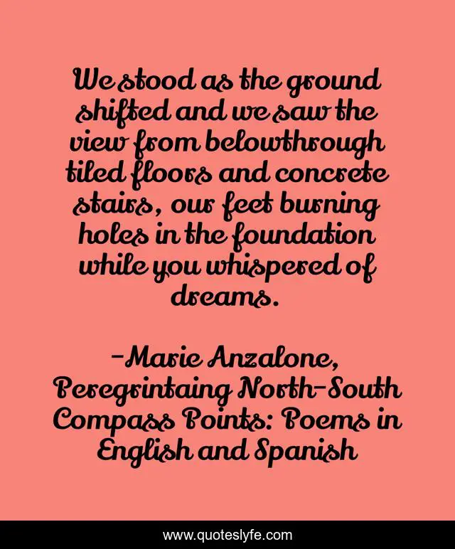 This page presents the quote "We stood as the ground shifted and we saw the view from belowthrough tiled floors and concrete stairs, our feet burning holes in the foundation while you whispered of dreams.". Author of this quote is Marie Anzalone, Peregrintaing North-South Compass Points: Poems in English and Spanish. This quote is about perception, love, affection,.
