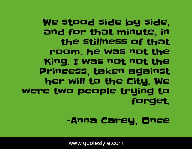This page presents the quote "We stood side by side, and for that minute, in the stillness of that room, he was not the King. I was not not the Princess, taken against her will to the City. We were two people trying to forget.". Author of this quote is Anna Carey, Once. This quote is about forgetting, sad,.