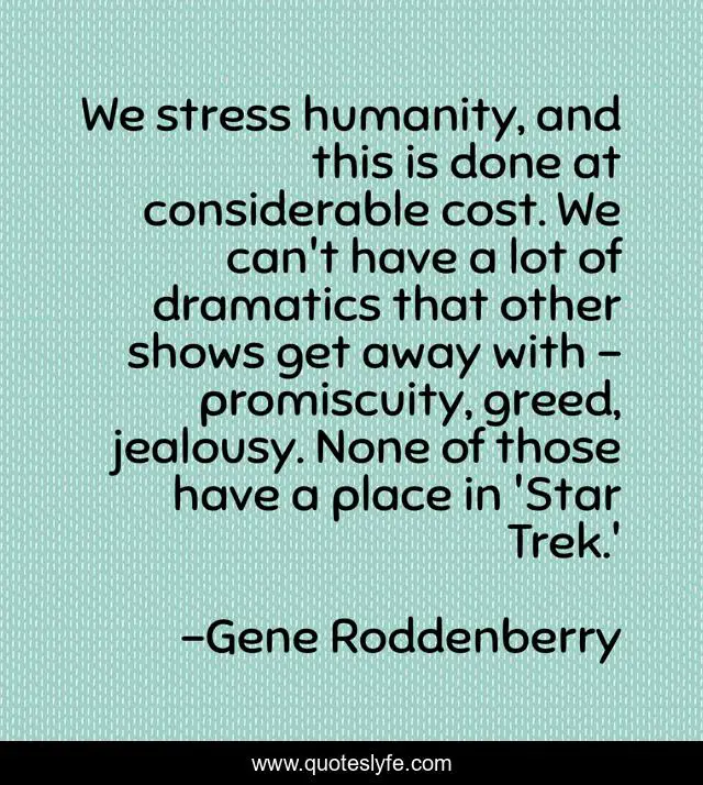 This page presents the quote "We stress humanity, and this is done at considerable cost. We can't have a lot of dramatics that other shows get away with - promiscuity, greed, jealousy. None of those have a place in 'Star Trek.'". Author of this quote is Gene Roddenberry. This quote is about stress, humanity, greed,.