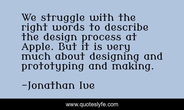 This page presents the quote "We struggle with the right words to describe the design process at Apple. But it is very much about designing and prototyping and making.". Author of this quote is Jonathan Ive. This quote is about struggle, words, apple,.