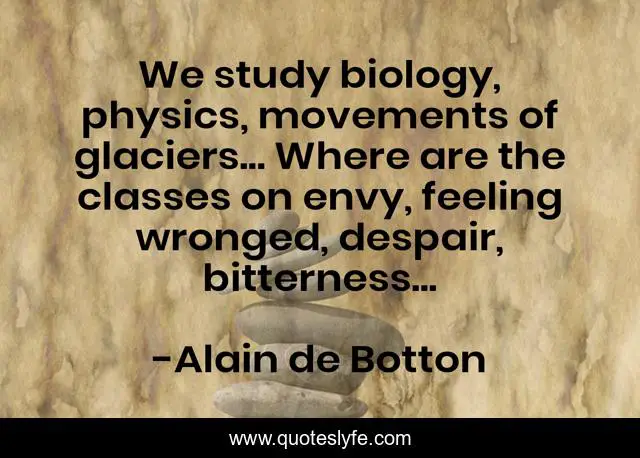 This page presents the quote "We study biology, physics, movements of glaciers... Where are the classes on envy, feeling wronged, despair, bitterness...". Author of this quote is Alain de Botton. .