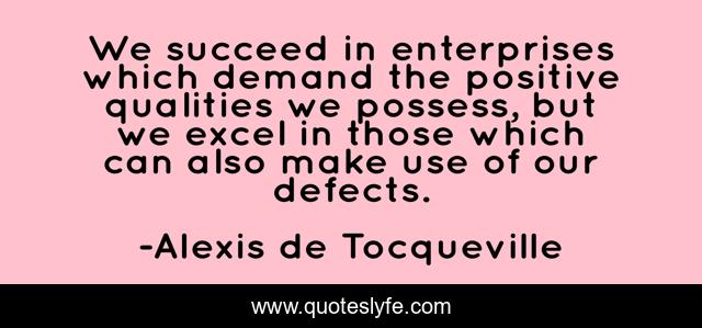 This page presents the quote "We succeed in enterprises which demand the positive qualities we possess, but we excel in those which can also make use of our defects.". Author of this quote is Alexis de Tocqueville. This quote is about positive, confidence, succeed, qualities,.