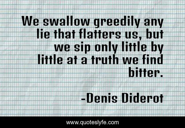 This page presents the quote "We swallow greedily any lie that flatters us, but we sip only little by little at a truth we find bitter.". Author of this quote is Denis Diderot. This quote is about lie, little, find,.