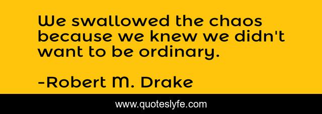 This page presents the quote "We swallowed the chaos because we knew we didn't want to be ordinary.". Author of this quote is Robert M. Drake. This quote is about lovequotes, sadquotes, poetry, quotes, instadaily, happyquotes, relationships, sayings, writer,.