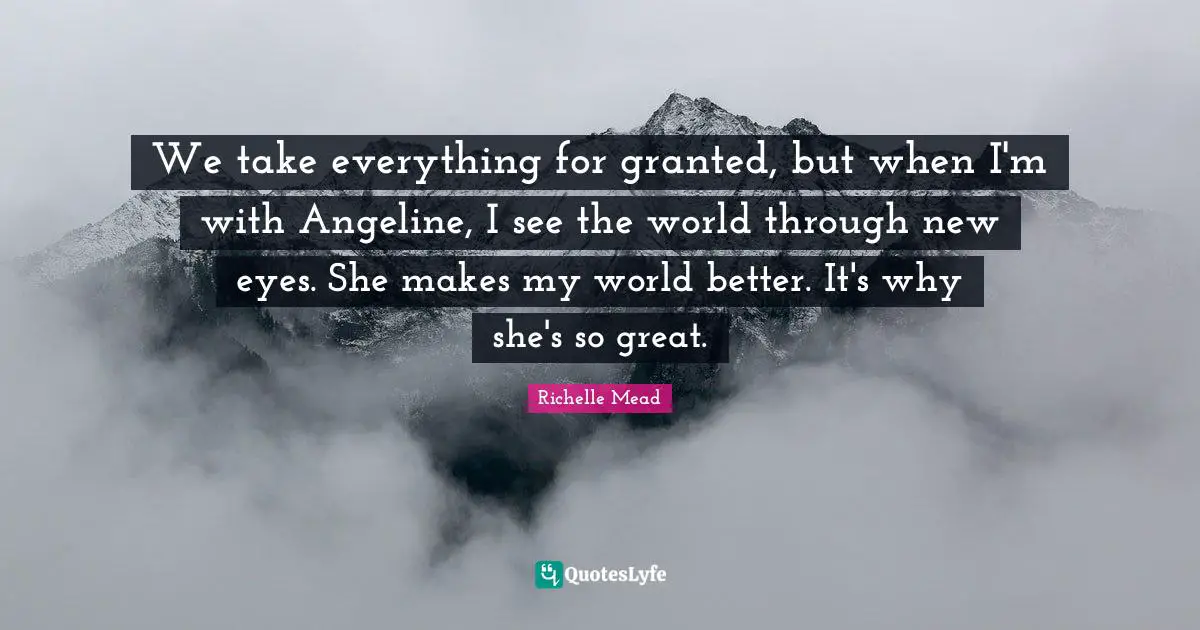 This page presents the quote "We take everything for granted, but when I'm with Angeline, I see the world through new eyes. She makes my world better. It's why she's so great.". Author of this quote is Richelle Mead. This quote is about world, new eyes, granted, eye,.