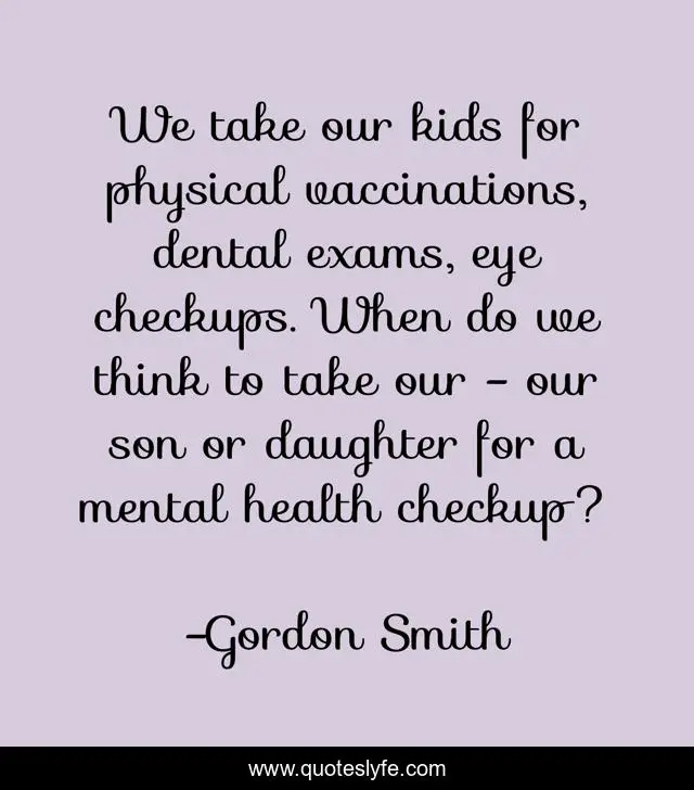This page presents the quote "We take our kids for physical vaccinations, dental exams, eye checkups. When do we think to take our - our son or daughter for a mental health checkup?". Author of this quote is Gordon Smith. This quote is about mental health, daughter, son,.