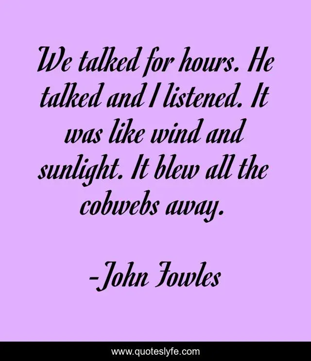This page presents the quote "We talked for hours. He talked and I listened. It was like wind and sunlight. It blew all the cobwebs away.". Author of this quote is John Fowles. This quote is about love, happiness, affection,.