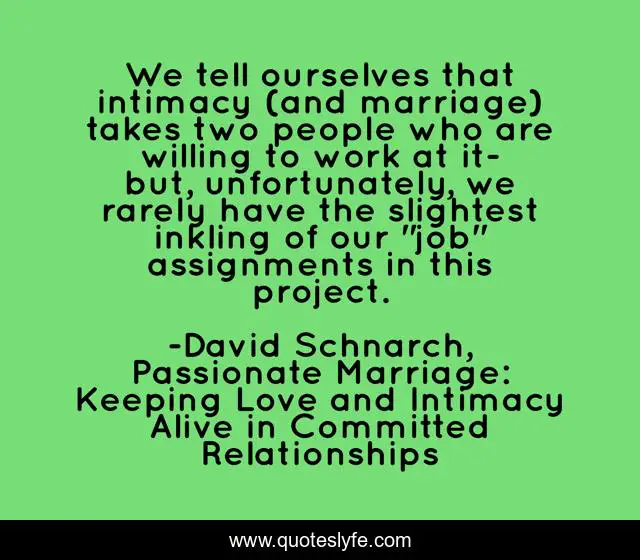 This page presents the quote "We tell ourselves that intimacy (and marriage) takes two people who are willing to work at it-but, unfortunately, we rarely have the slightest inkling of our "job" assignments in this project.". Author of this quote is David Schnarch, Passionate Marriage: Keeping Love and Intimacy Alive in Committed Relationships. .