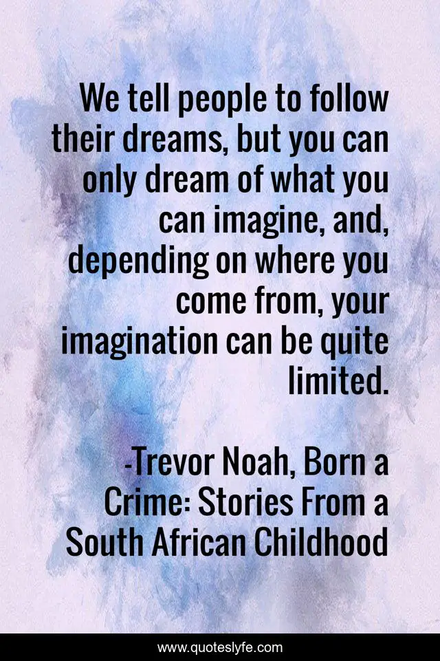 This page presents the quote "We tell people to follow their dreams, but you can only dream of what you can imagine, and, depending on where you come from, your imagination can be quite limited.". Author of this quote is Trevor Noah, Born a Crime: Stories From a South African Childhood. .
