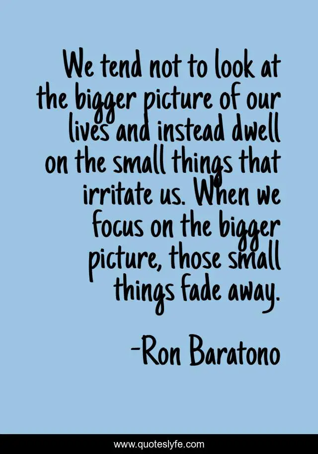 This page presents the quote "We tend not to look at the bigger picture of our lives and instead dwell on the small things that irritate us. When we focus on the bigger picture, those small things fade away.". Author of this quote is Ron Baratono. This quote is about dwell, life, focus, irritation,.