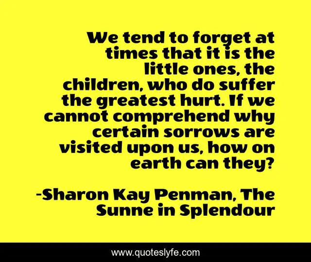 This page presents the quote "We tend to forget at times that it is the little ones, the children, who do suffer the greatest hurt. If we cannot comprehend why certain sorrows are visited upon us, how on earth can they?". Author of this quote is Sharon Kay Penman, The Sunne in Splendour. This quote is about pain, children,.