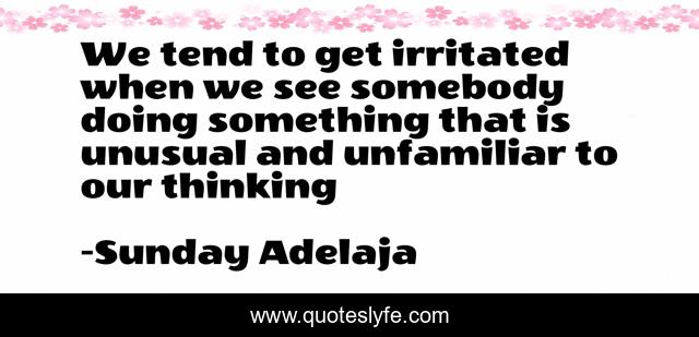 This page presents the quote "We tend to get irritated when we see somebody doing something that is unusual and unfamiliar to our thinking". Author of this quote is Sunday Adelaja. This quote is about unusual, somebody, get, thinking, we, unfamiliar, tend, see, something,.