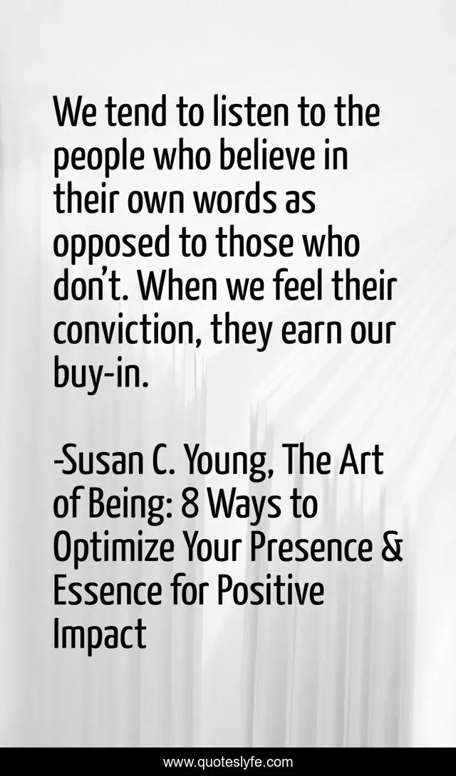 This page presents the quote "We tend to listen to the people who believe in their own words as opposed to those who don’t. When we feel their conviction, they earn our buy-in.". Author of this quote is Susan C. Young, The Art of Being: 8 Ways to Optimize Your Presence & Essence for Positive Impact. This quote is about self-confidence, susan-young, relationship, communication-skills, communication, charisma, first-impressions, charm, motivational-speaker,.