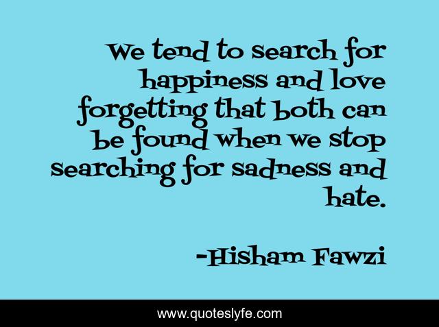This page presents the quote "We tend to search for happiness and love forgetting that both can be found when we stop searching for sadness and hate.". Author of this quote is Hisham Fawzi. This quote is about life, love, affection, inspirational, enthusiasm, hate, happiness,.