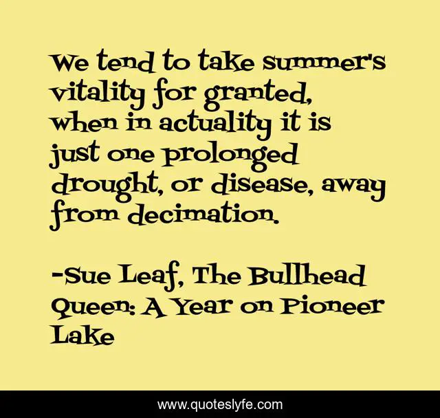 This page presents the quote "We tend to take summer's vitality for granted, when in actuality it is just one prolonged drought, or disease, away from decimation.". Author of this quote is Sue Leaf, The Bullhead Queen: A Year on Pioneer Lake. This quote is about summer, drought, vitality,.
