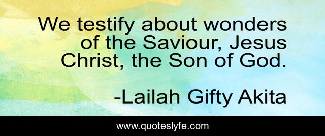This page presents the quote "We testify about wonders of the Saviour, Jesus Christ, the Son of God.". Author of this quote is Lailah Gifty Akita. This quote is about jesus-christ, god, spiritual-sayings, testimony,.