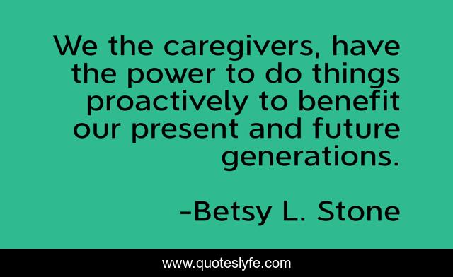 This page presents the quote "We the caregivers, have the power to do things proactively to benefit our present and future generations.". Author of this quote is Betsy L. Stone. This quote is about future-generations, family-relationships, family,.
