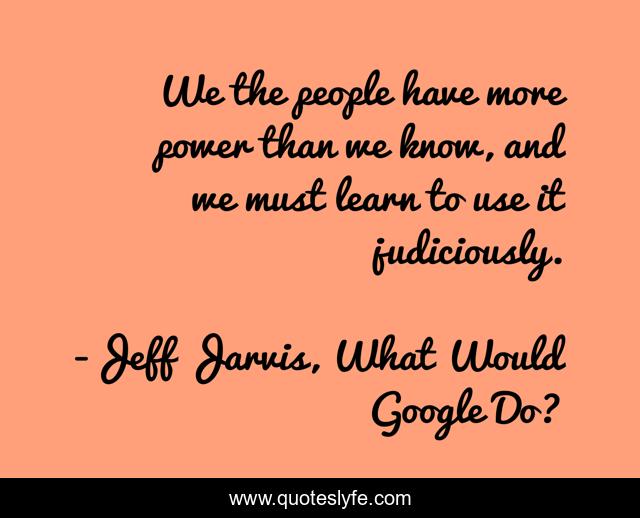 This page presents the quote "We the people have more power than we know, and we must learn to use it judiciously.". Author of this quote is Jeff Jarvis, What Would Google Do?. This quote is about culture, popularity, influence, revolution,.