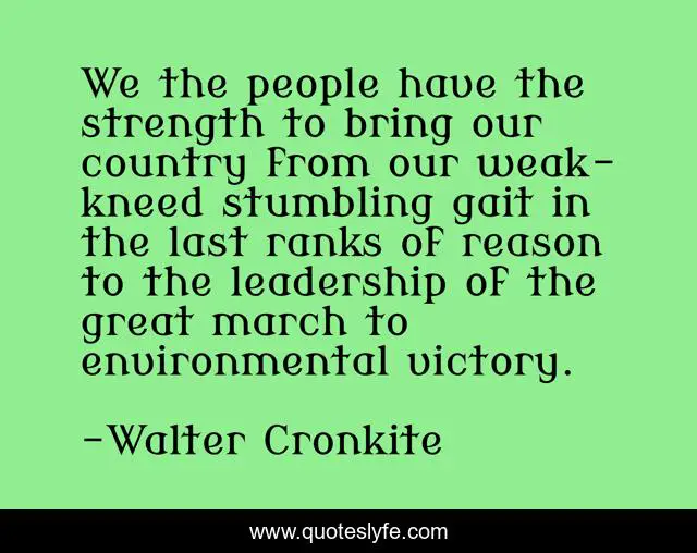 This page presents the quote "We the people have the strength to bring our country from our weak-kneed stumbling gait in the last ranks of reason to the leadership of the great march to environmental victory.". Author of this quote is Walter Cronkite. This quote is about great, leadership,.