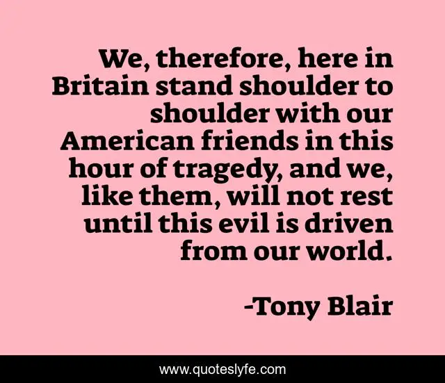 This page presents the quote "We, therefore, here in Britain stand shoulder to shoulder with our American friends in this hour of tragedy, and we, like them, will not rest until this evil is driven from our world.". Author of this quote is Tony Blair. This quote is about friends, tragedy, evil,.