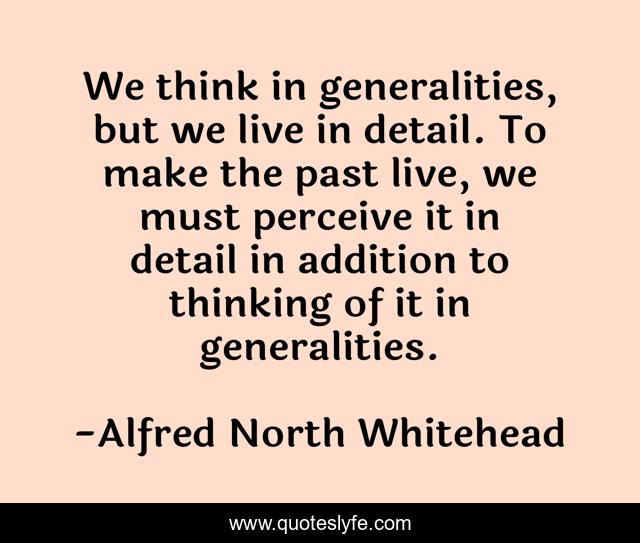 This page presents the quote "We think in generalities, but we live in detail. To make the past live, we must perceive it in detail in addition to thinking of it in generalities.". Author of this quote is Alfred North Whitehead. This quote is about past, generalities, detail, think,.
