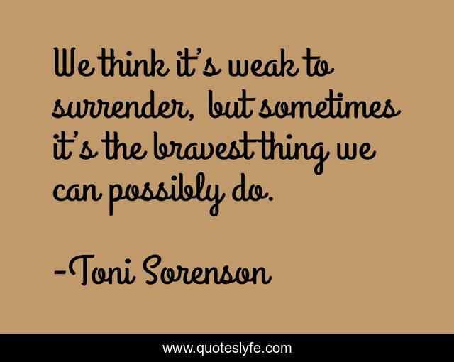This page presents the quote "We think it’s weak to surrender, but sometimes it’s the bravest thing we can possibly do.". Author of this quote is Toni Sorenson. .