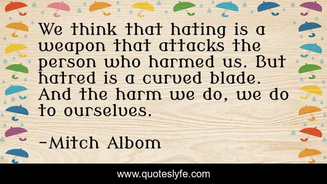 This page presents the quote "We think that hating is a weapon that attacks the person who harmed us. But hatred is a curved blade. And the harm we do, we do to ourselves.". Author of this quote is Mitch Albom. .