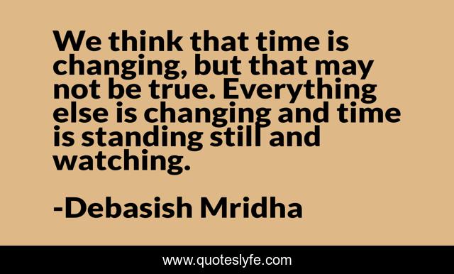 This page presents the quote "We think that time is changing, but that may not be true. Everything else is changing and time is standing still and watching.". Author of this quote is Debasish Mridha. This quote is about miraboli, oscar-wilde, time-is-changing, philosophy, debasish-mridha, everything-else-is-changing, quotes, time-is-standing-still, gandhi,.