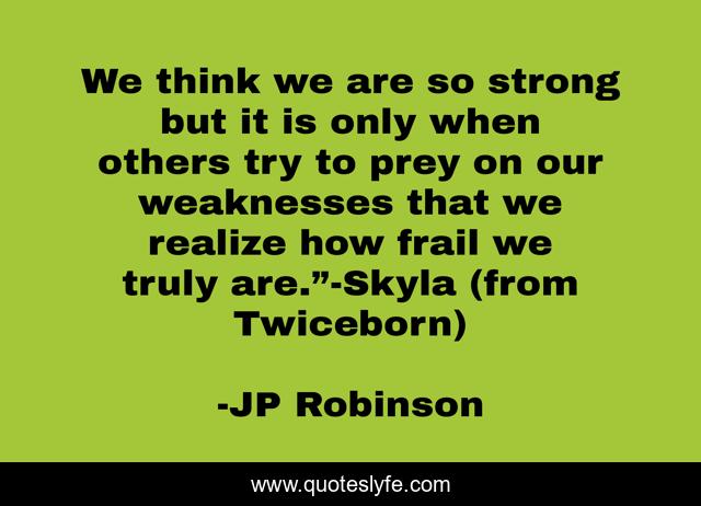 This page presents the quote "We think we are so strong but it is only when others try to prey on our weaknesses that we realize how frail we truly are.”-Skyla (from Twiceborn)". Author of this quote is JP Robinson. This quote is about strength, love, power, weakness, christian-fiction, thought-provoking, inspirational, enthusiasm, affection,.