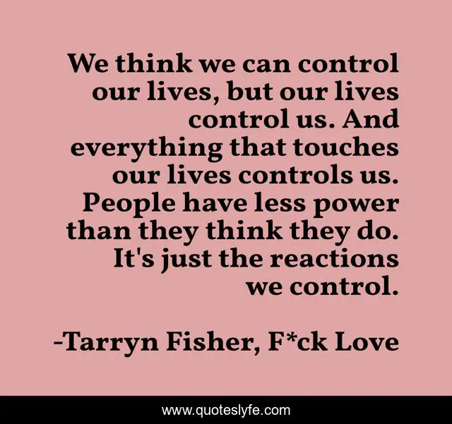 This page presents the quote "We think we can control our lives, but our lives control us. And everything that touches our lives controls us. People have less power than they think they do. It's just the reactions we control.". Author of this quote is Tarryn Fisher, F*ck Love. .