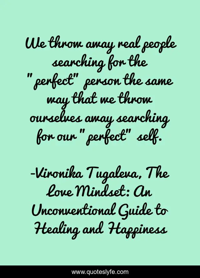 This page presents the quote "We throw away real people searching for the "perfect" person the same way that we throw ourselves away searching for our "perfect" self.". Author of this quote is Vironika Tugaleva, The Love Mindset: An Unconventional Guide to Healing and Happiness. This quote is about perfect, real, self, perfection, truth, authenticity, perfect-self,.