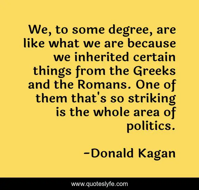 This page presents the quote "We, to some degree, are like what we are because we inherited certain things from the Greeks and the Romans. One of them that's so striking is the whole area of politics.". Author of this quote is Donald Kagan. This quote is about romans, greeks, like,.