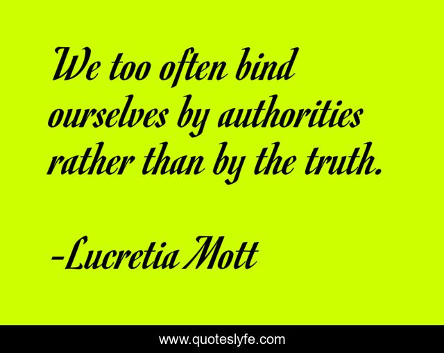 This page presents the quote "We too often bind ourselves by authorities rather than by the truth.". Author of this quote is Lucretia Mott. This quote is about rather, ourselves,.