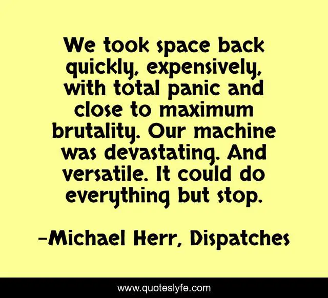 This page presents the quote "We took space back quickly, expensively, with total panic and close to maximum brutality. Our machine was devastating. And versatile. It could do everything but stop.". Author of this quote is Michael Herr, Dispatches. This quote is about vietnam, war,.