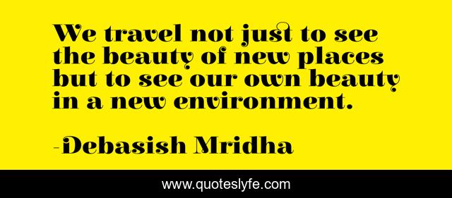 This page presents the quote "We travel not just to see the beauty of new places but to see our own beauty in a new environment.". Author of this quote is Debasish Mridha. This quote is about beauty-in-a-new-environment, miraboli, oscar-wilde, beauty-of-new-places, travel, philosophy, debasish-mridha, tagore, quotes,.
