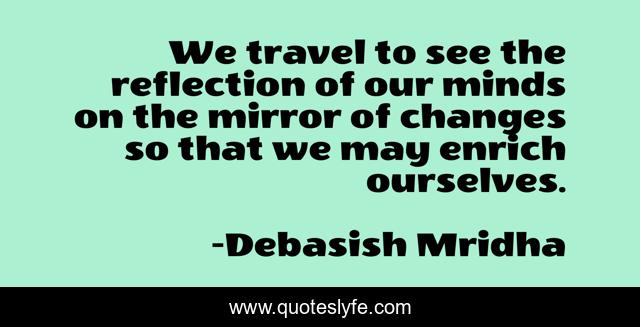 This page presents the quote "We travel to see the reflection of our minds on the mirror of changes so that we may enrich ourselves.". Author of this quote is Debasish Mridha. This quote is about enrich-ourselves, travel, philosophy, debasish-mridha, quotes, mirror-of-changes, inspirational, enthusiasm, debasish-mridha-m-d,.