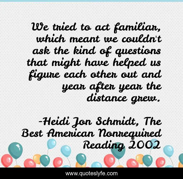 This page presents the quote "We tried to act familiar, which meant we couldn't ask the kind of questions that might have helped us figure each other out and year after year the distance grew.". Author of this quote is Heidi Jon Schmidt, The Best American Nonrequired Reading 2002. .